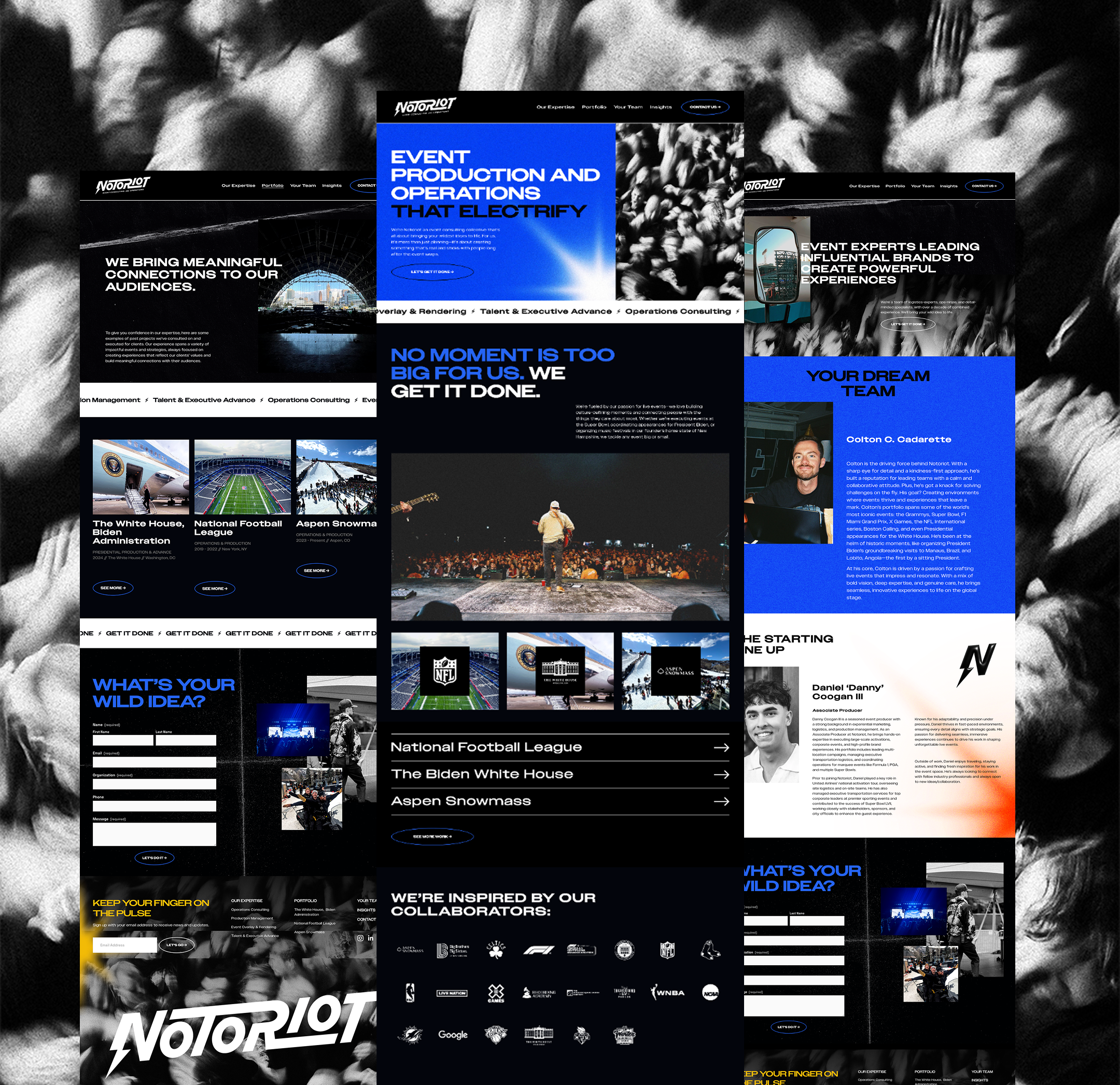 We started working with Notoriot at a crucial point: the founder was pivoting from freelancer to growing business. He was working with the biggest names in sports and entertainment and traveling the world with the Biden Administration on Air Force One, but he needed a professional brand to grow and compete with other top players; one that would work as hard as he does, and still let his personality shine.